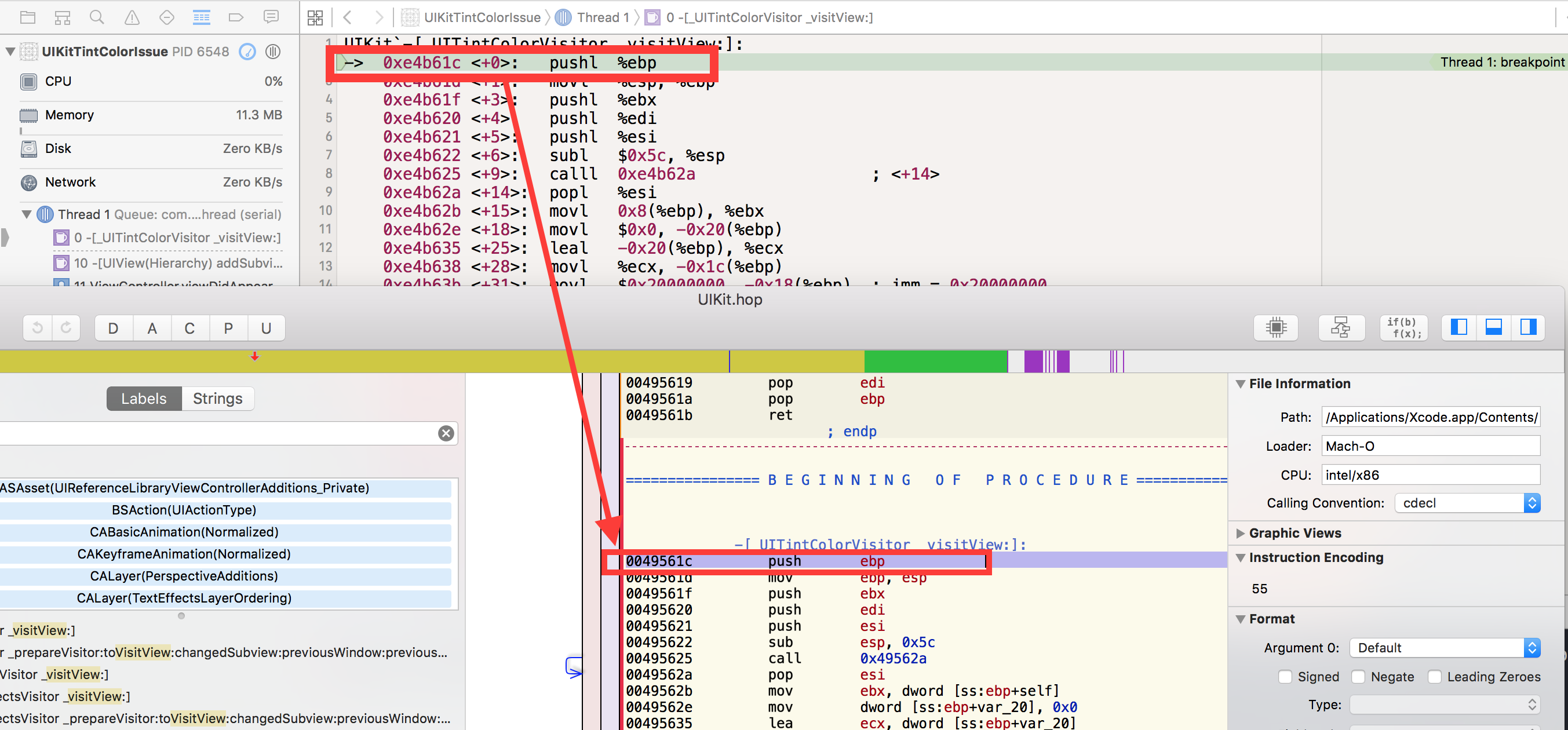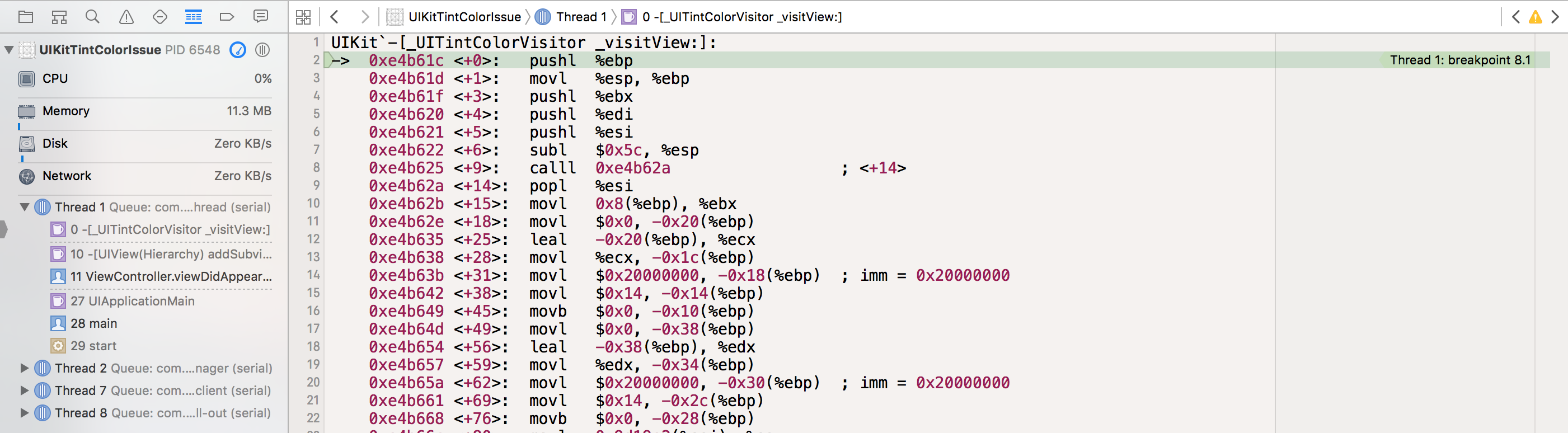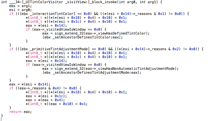 When stepping into the breakpoint in -[_UITintColorVisitor _visitView:] you are greeted with a cryptic wall of assembly code. I started out with very barebones knowledge of understanding/investigating complex assembly code, but this bug forced me to learn some tricks that hopefully are useful to you as well!
