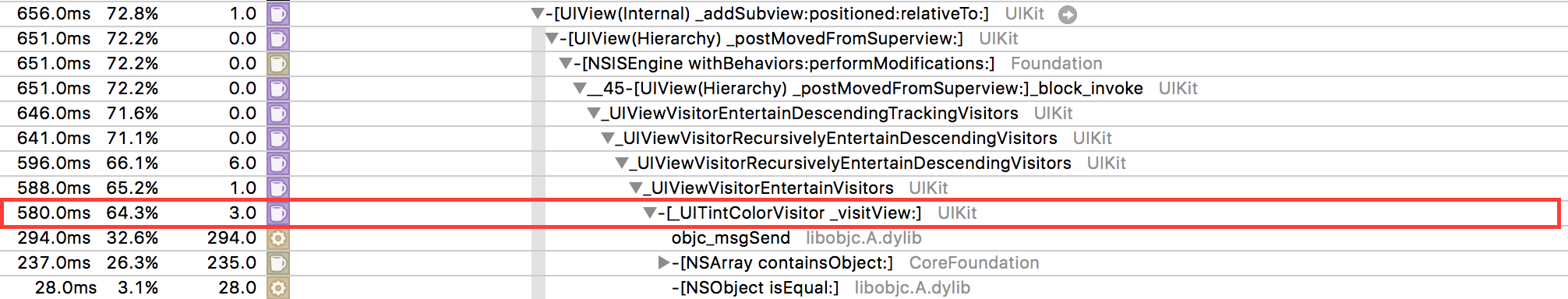 A majority of the time is adding subviews is spent within [_UITintColorVisitor _visitView:]. In this example it’s 64% of the time; and the proportion only increases with the amount of subviews we’re adding.