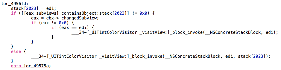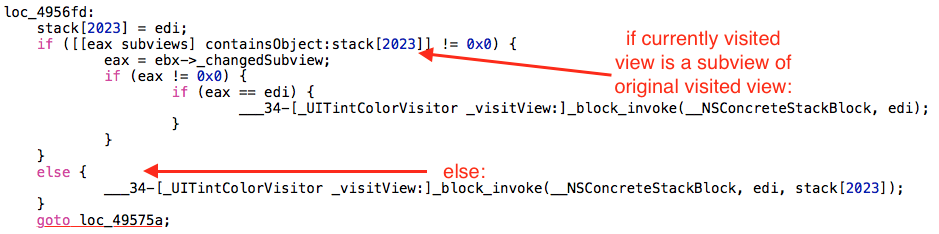 In both cases, whether it is a subview or not, we end up calling: ___34-[_UITintColorVisitor _visitView:]_block_invoke. In the case of the currently visited view being a subview of the original visited view, we pass two arguments to the block, in the other case we pass only one.